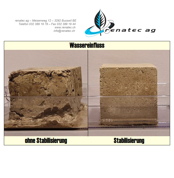 Durch das Einmischen von Spezialbindemitteln in anstehenden Baugrund (Kies, Lehm oder tonhaltige Böden) wird die Widerstandsfähigkeit gegen mechanische Beanspruchungen (z.B. Verkehr, Gebäudelasten o. dgl.) erhöht und die Empfindlichkeit gegenüber Witterungseinflüssen (Wasser, Frosteinwirkungen) vermindert. Durch den Einsatz von mobilen Brechern (Arbeitstiefen bis 40cm fest) kann zusätzlich die Kornabstufung von anstehendem Bodenmaterial optimiert werden.