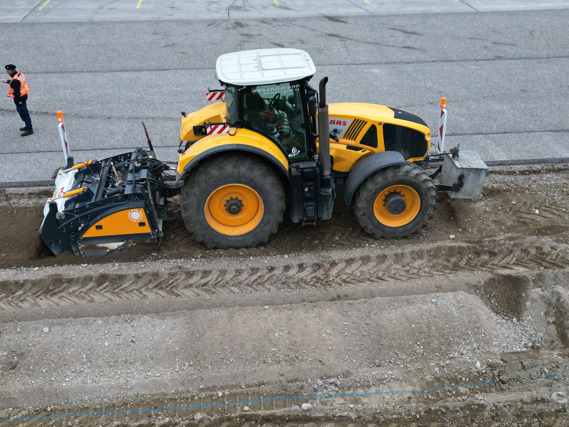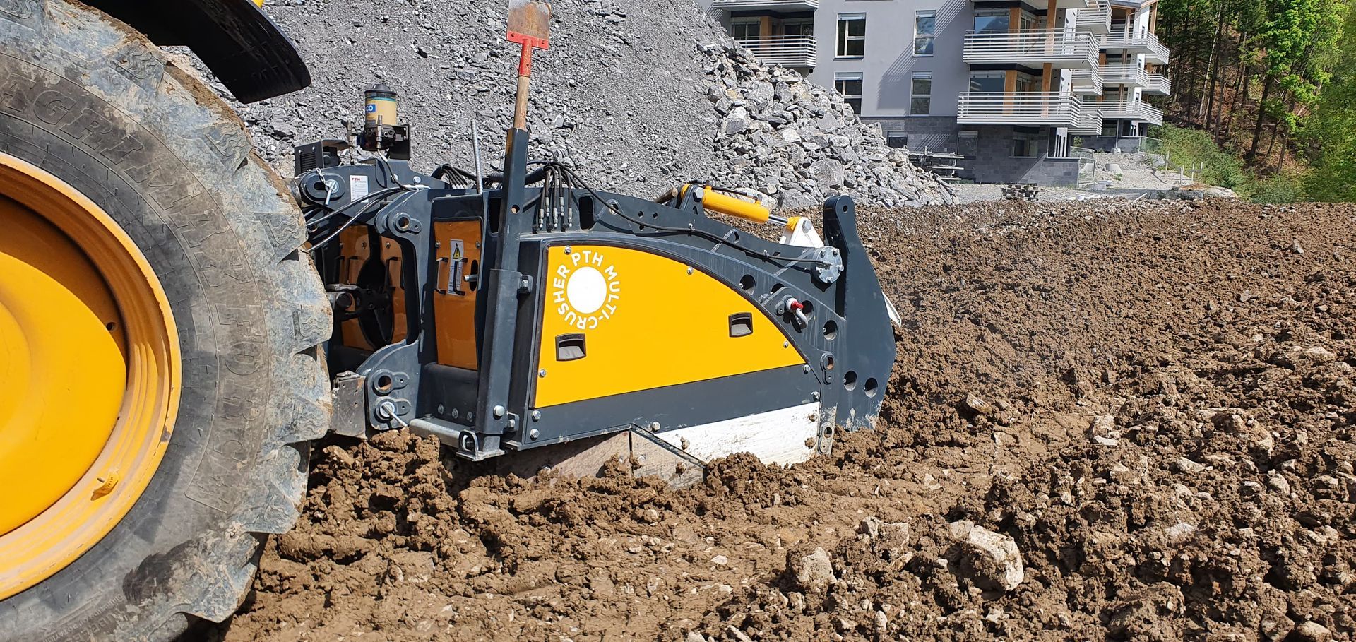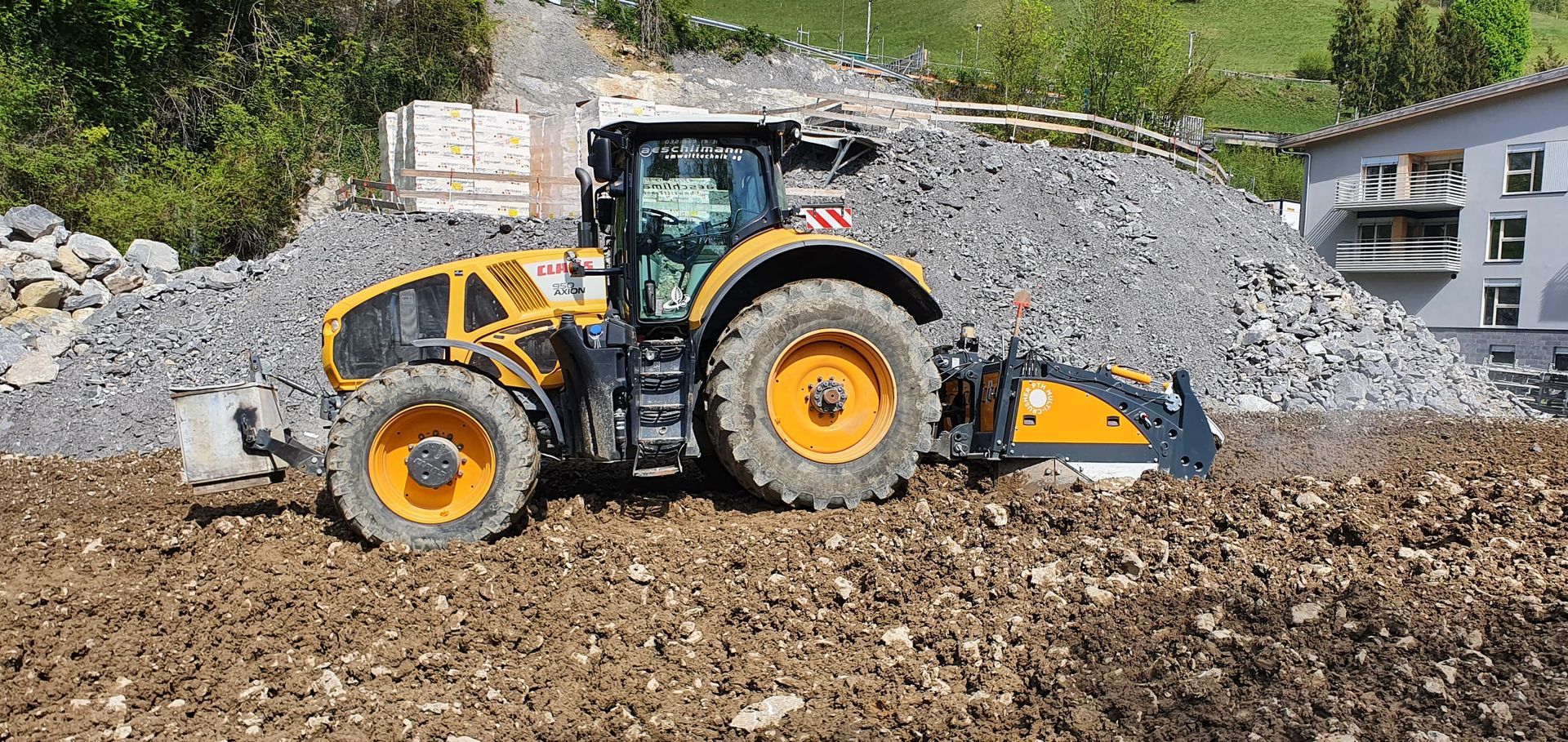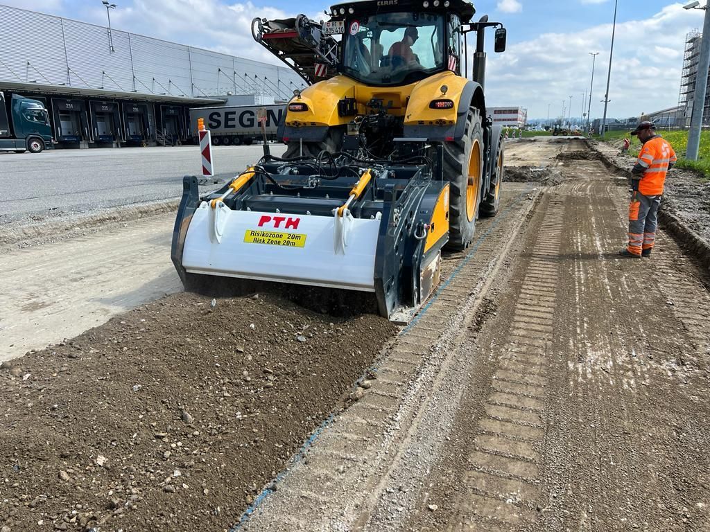 - Vorbrechen von anstehendem Baugrund bei vorhandenen Steinen, Zerkleinern auf geeignete Kornabstufung als Vorbereitung für eine Baugrundverbesserungsmassnahme
